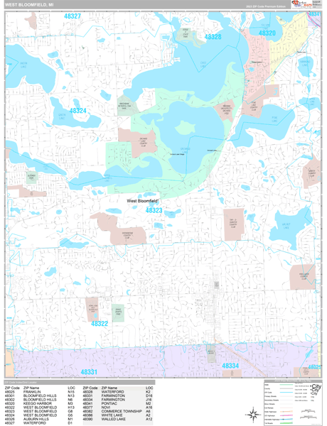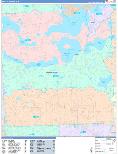 West Bloomfield, MI Zip Code Wall Map Red Line